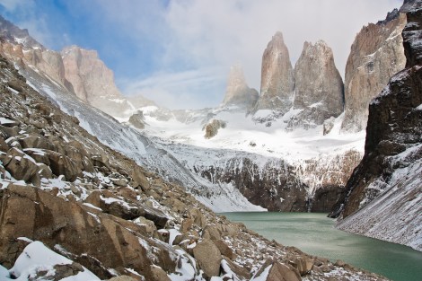 Tras una hora de extenuante subida e innumerables resbalones alcanzábamos nuestro objetivo: el Mirador de las Torres. Lo habíamos conseguido. A nuestros pies la laguna, encima de ella las verticales paredes de los pies de las Torres sobre las que se asienta el Glaciar Torre y, finalmente, coronando la vista, las tres Torres aún cubiertas por nubes. Nos sentamos a recuperar el aliento y disfrutar de la mermada vista. Eran las 10 de la mañana.