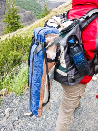 El equipo de Gaby. La mochila cortesía de ‘5 jotas’ que regalaban con un jamón… Y sí, de ella cuelga la tienda ya famosa en todo el parque asegurada con un fantástico cordón roto de zapato hallado en el hostal de Melinda