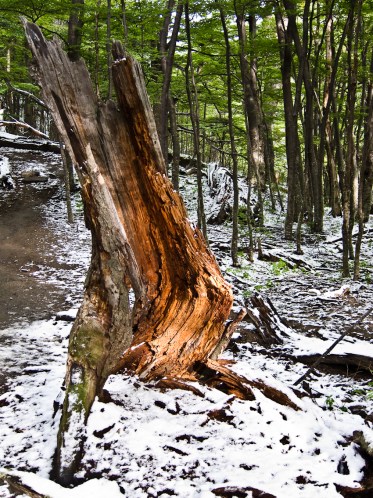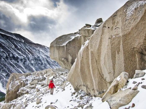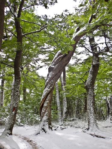 A pesar de la máxima fiabilidad que nos proporcionaba el invento de la bolsa, pronto, a medida que avanzábamos y subíamos, aquella fina lluvia se convirtió en nieve ligera y seca que ya no calaba. A medida que avanzábamos los copos se hacían más y más grandes y el paisaje que nos rodeaba se cubría de blanco. Las oscuras nubes que nos habían acompañado desde nuestra llegada parecían bajar cada vez más, moviéndose con velocidad arrastradas por el fuerte viento reinante.