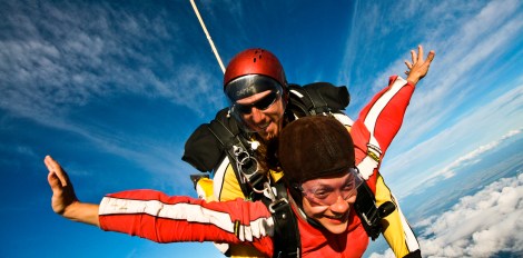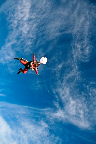 Y de repente, cuando uno más disfruta… se abre el paracaídas y un repentino tirón te frena con tal fuerza que parece que te empuje hacia arriba. El brutal ruido que nos rodeaba se detuvo repentinamente y la caída pareció detenerse. Suspendidos en el aire respiramos, y una apacible sensación de calma y de paz lo inundó todo. Donde había ruido ahora sólo nos rodeaba silencio. La euforia se tornó tranquilidad. Nos quitamos las gafas protectoras y seguimos flotando en el aire sobre el inmenso Lago Taupo, veíamos los dorados campos iluminados por las luces del atardecer y, a lo lejos, los picos nevados de los Alpes del Norte. No se podía pedir más.
