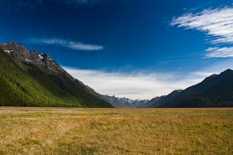Al día siguiente amanecimos al alba y, por primera vez, abandonábamos el camping antes que nadie. Con Bob aún algo frío reemprendíamos nuestro camino hacia el Sudoeste, internándonos en otro Parque Nacional, el Fiordland N.P. La carretera 94 era una maravilla. Cada ciertos kilómetros el paisaje te sorprendía con algo nuevo: Que si las paredes verticales de una montaña, que si una llanura amarilla que se topa con los últimos resquicios montañosos de los Alpes, que si un lago, que si un campo repleto de lilas, que si un bosque… y ¡cómo no! decenas de caminos marcados empezando a un lado y otro de la carretera para recorrer, algunos en tan sólo diez minutos, otros en varios días. Parecía que todo perdía su factor sorpresa, ¿qué más iba a venir después que nos pudiera asombrar?