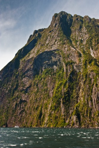 Veíamos algunos barcos de dos pisos al otro lado del fiordo. La comparación de las embarcaciones con la grandeza de las montañas que flanqueaban el fiordo los dejaba en ridículo. ¡Daba igual cuanta gente llegara a Milford en un solo día! Una vez en el agua, ante la vasta dimensión de la naturaleza todo lo demás parecía diminuto.