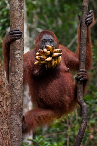 A la vista de los orangutanes que aparecieron aquella tarde no debía haber mucha fruta en la selva. Las hembras, siempre con su inseparable cría a las espaldas aparecían desde cualquier árbol de cuantos nos rodeaban, moviéndose con una facilidad envidiable de un árbol a otro, agarrándose a ramas tan pequeñas que parecía que iban a quebrarse dejando caer a aquellos hombrecillos rojos al vacío. Pero ninguna rama se partía, si acaso, se doblaba al soportar su peso y les permitía alcanzar árboles, si cabía, aún más alejados.