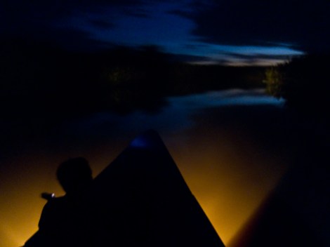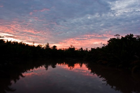 De vuelta a nuestra realidad, esperando a los orangutanes y charlando con los coruñeses se nos había hecho demasiado tarde. El ‘klotok’ nos esperaba de nuevo en el muelle. Yusa había preparado unos buñuelos de banana deliciosos que saboreamos mientras disfrutamos de un espectacular atardecer que iluminaba el cauce el río con rojos, naranjas, lilas, y azules. Cayó la noche y aún estábamos a unas dos horas de Kumai. El recorrido del río apenas podía adivinarse y Momo se encaramó a la proa del ‘klotok’ para iluminar al capitán con una linterna.