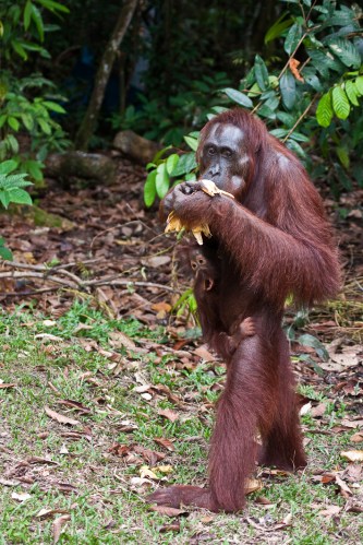 Al día siguiente alcanzamos ‘Camp Leakey’. Caminamos unos cuantos metros desde el muelle y, al llegar a las cabañas que fueron allí construidas en los setenta, vimos al primer orangután. Gina nos esperaba un poco antes de la hora de comer, con su hijo en brazos. Erguida, aguantando al pequeño, disfrutaba de unas ricas bananas que uno de los cuidadores le había dado. Nos sorprendió ver como no dejaba en ningún momento a su pequeño, al que protegía ante cualquier amenaza.