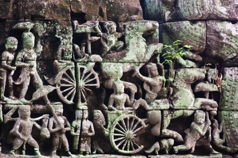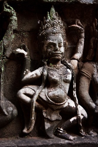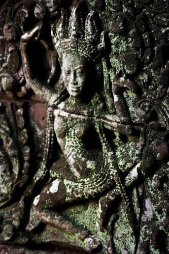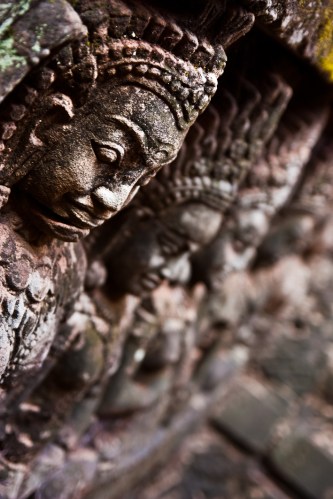 Era fácil perderse por los patios cerrados y estrechos pasillos de Ta Prohm en los que, por sorpresa, aparecían en algún recoveco estatuas de Buda bajo las que ardían barras de incienso que impregnaban con su olor los húmedos corredores del templo. Los bajorrelieves que cubrían las paredes estaban tomados por líquenes, musgos y pequeñas plantas arraigadas entre sus huecos.