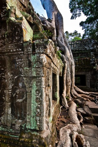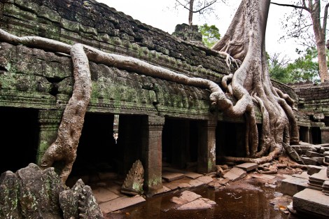 Llegamos a Ta Prohm, un templo budista dedicado a la madre de Jayavarman VII en el que la vegetación le ganó definitivamente la partida al hombre y fue engullido literalmente por la naturaleza. Ta Prohm es, probablemente, el mejor ejemplo de cómo se debieron encontrar los templos los exploradores europeos cuando llegaron a aquella región a orillas del lago Tonle Sap.