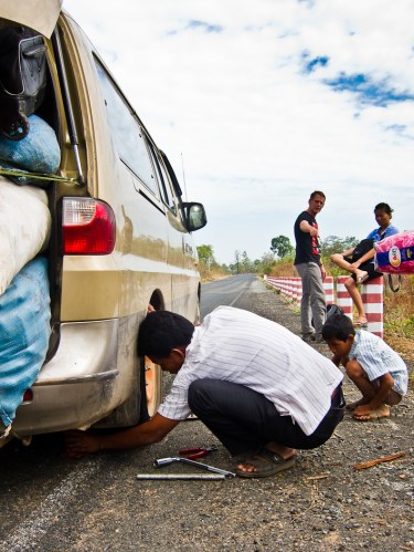 A medio camino, en mitad de la carretera, la camioneta se paró y nos hicieron bajar. Habíamos pinchado. Sin sacar la carga de bolsas y mochilas empezaron a levantar la furgoneta con ladrillos, piedras y un rudimentario gato. El conductor no era la primera vez que cambiaba una rueda. En diez minutos las sardinas volvían a encajarse en la lata.