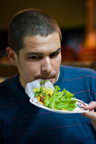Finalmente encontramos un pequeño local que tenía comida a la vista. Había que coger al toro por los cuernos y ya ni preguntamos, nos sentamos y señalamos la comida con el dedo. Aquella gente era bastante espabilada y, a los pocos minutos, teníamos la mesa llena de comidas que nunca habíamos visto antes, una especie de tortillas con trozos de salchicha y gambas que debían unirse a diversas verduras, lechuga y cilantro y enrollarse en un papel (sí, papel). ‘Oye, ¿seguro que el papel este se come?’ Al final, resultó que aquella gente y su comida no eran laosianas, sino vietnamitas y, visto lo visto, los viets sabían manejarse mejor que los laosianos ante nuestra presencia.