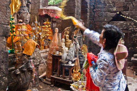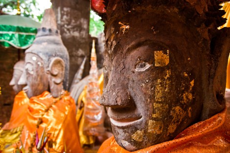 El recinto está dividido en seis terrazas a las que se accede por una escalinata central que nos hizo sudar de lo lindo. El premio, como no, se hallaba en la última terraza donde los locales iban y venían para orar frente a las tallas del templo que rociaban con un agua teñida con el naranja de las caléndulas, preparándose, por lo que entendimos, para la celebración del nuevo año laosiano, del que, no sufran, tendrán noticias pronto por aquí…