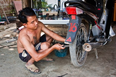 Pinchar sería un problema en cualquier lugar pero no en Laos. Si en un pueblo hay cinco casas una tendrá, al menos, un mínimo taller... ¡Por 60 céntimos de euro parchecito y a rodar!