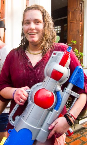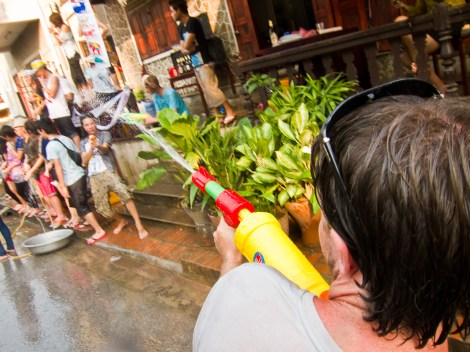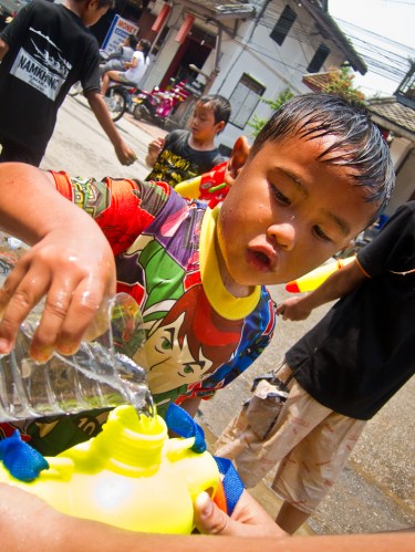 Las motos son las que más recibían, sobre todo si iban en ellas un par o tres de chicas guapas. Los tuc-tucs eran uno de los blancos preferidos de los ‘falangs’ (‘guiris’ para los laosianos); ya saben, viejos ajustes de cuentas por intentos de timo, rodeos para ir a la tienda del ‘cuñao’, etc. Justicia divina que hace bueno el dicho recién acuñado de ‘a todo tuc-tuquero le llega su Pi Mai’. Los pick-ups, por su parte, solían ir llenos de agua en su parte trasera para recargar cubos y palanganas con sólo agacharse un poco; desde ellos, los expertos lanzadores locales curtidos en mil batallas del Pi Mai lanzaban certeros disparos y cubos de agua aprovechando su ventajosa ubicación elevada.