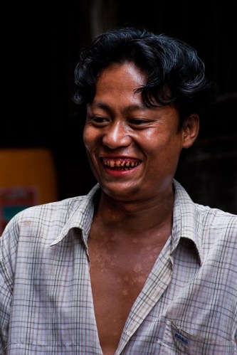 Aquellas pinturas resultaron ser un maquillaje, la Thanaka, que se extrae de un árbol y protege del sol. El rojo que cubría los dientes y teñía los labios de los hombres no era sangre sino betel, un producto que mezclan dentro de una hoja con tabaco y otros ingredientes como tomate o coco y que se va escupiendo, llenando las aceras de innumerables manchas rojas que se confunden con sangre. Las faldas que visten los hombres son el ‘Longyi’, el vestido tradicional que durante mucho tiempo fue de obligado uso por decreto del gobierno.