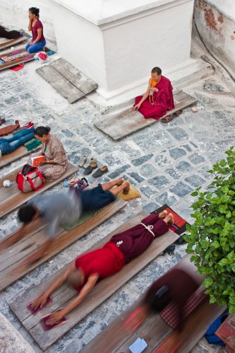 Hoy siguen acudiendo a Boudanath cientos de peregrinos a diario. En el sentido de las agujas del reloj rodeaban la estupa varias veces haciendo girar a su paso unos cilindros gravados con diversas oraciones. Otros rezaban de pie frente a unas plataformas de madera que utilizaban para deslizarse hasta estirarse totalmente sobre ellas una y otra vez.