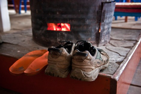 La tarde del segundo día alcanzamos la aldea de Ghorepani, cerca de los pasos de montaña más altos por los que nos llevaría el camino. En el humilde guesthouse nos esperaba una amable familia y un acogedor salón con el hogar encendido. En las paredes del salón nos topamos de nuevo con las fotografías de las montañas que podían verse desde ese mismo pueblo pero, por la ventana, nosotros no veíamos más que un cielo plano, gris, aferrado a las laderas.