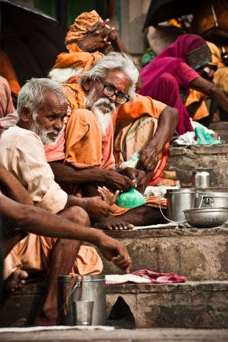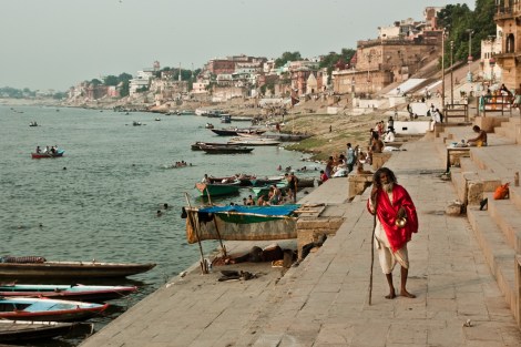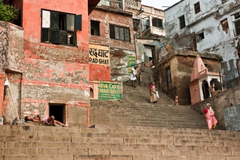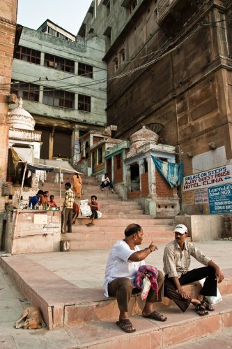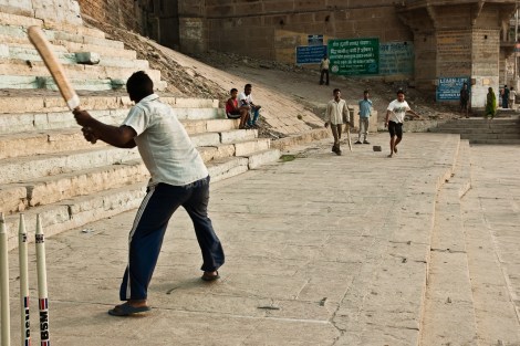 En la ciudad vieja de Benarés los ‘galis’, apestosos callejones estrechos, desembocan en las largas escalinatas que son los ‘ghats’, coronados normalmente por un templo. Allí encontramos un alboroto diferente. Las bocinas de los coches y el ruido de los motores habían sido sustituidos por el bullicio de las familias bañándose en el Ganges, los numerosos barqueros tratando de convencernos para que subiéramos a uno de los botes, las señoras que iban y venían con sus saris incomprensiblemente impolutos, los barberos que ofrecían sus servicios al ver una incipiente barba, los ‘sadhus’ que te explicarían la relación entre tu conducta y el ‘karma’, los jóvenes jugando a cricket, los niños que te pedían una moneda o una foto…