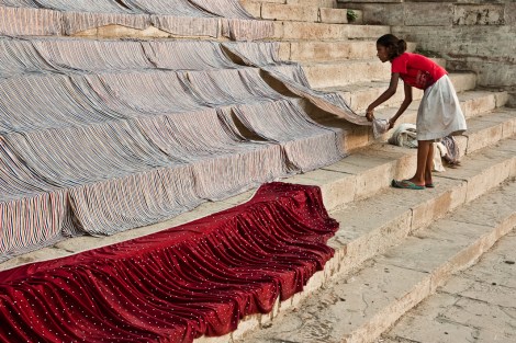 El ghat Manikarnika no dormía, estaba abierto 24 horas preparando las cremaciones de los afortunados que habían encontrado la muerte en aquella ciudad o cuyas familias habían podido sufragar el traslado del cadáver hasta allí. Si Benarés es la ciudad en la que todo hindú quisiera morir, el ghat Manikarnika es donde todos quisieran ser incinerados. El traslado de los cuerpos corre a cargo de los ‘doms’, una casta de intocables que llevan a los cuerpos por los callejones hasta el ‘ghat’ en camillas de bambú cubiertas por una tela. La madera se apila en la parte de atrás del ‘ghat’, las brasas calientan el ya tórrido ambiente y los hombres trabajan sin descanso trasladando troncos de una madera clara, de sándalo, para los más ricos, o tratando de apagar las brasas de la última cremación. Mientras, los perros olfatean el suelo y los cuervos sobrevuelan la zona.