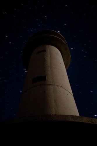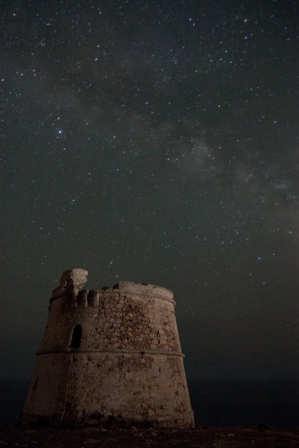 Catorce segundos de oscuridad y de nuevo por mi derecha veo como se ilumina una porción de tierra, la luz me deslumbra y se desvanece rápido por mi izquierda. Mientras camino hacia la torre de vigía puedo ver a lo lejos algunas luces de la playa de Migjorn y, al fondo, sobre la mola, el destello del otro gran faro de la isla. Las estrellas y la vía láctea se ven con más claridad en esta zona que en las salinas. La única contaminación lumínica es la del faro que he dejado unos quinientos metros atrás y que, en este caso, me ayuda a iluminar la torre de vigía.