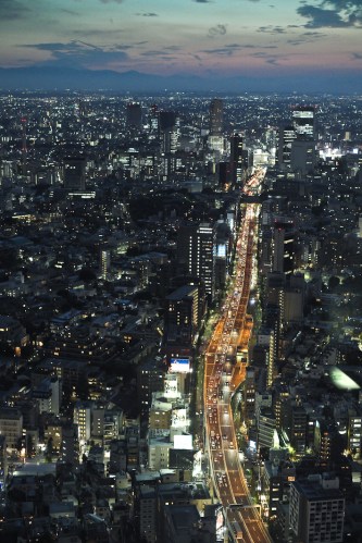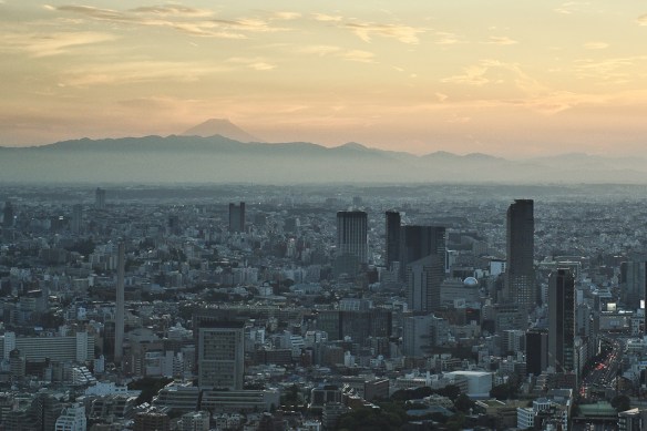 El sol se va a poner y, a lo lejos, mirando hacia el sudoeste donde debe acabar la ciudad, una particular silueta asoma tras una línea de montañas bajas. Efectivamente, ¡es el Monte Fuji! ¡Y lo estamos viendo desde Tokyo!